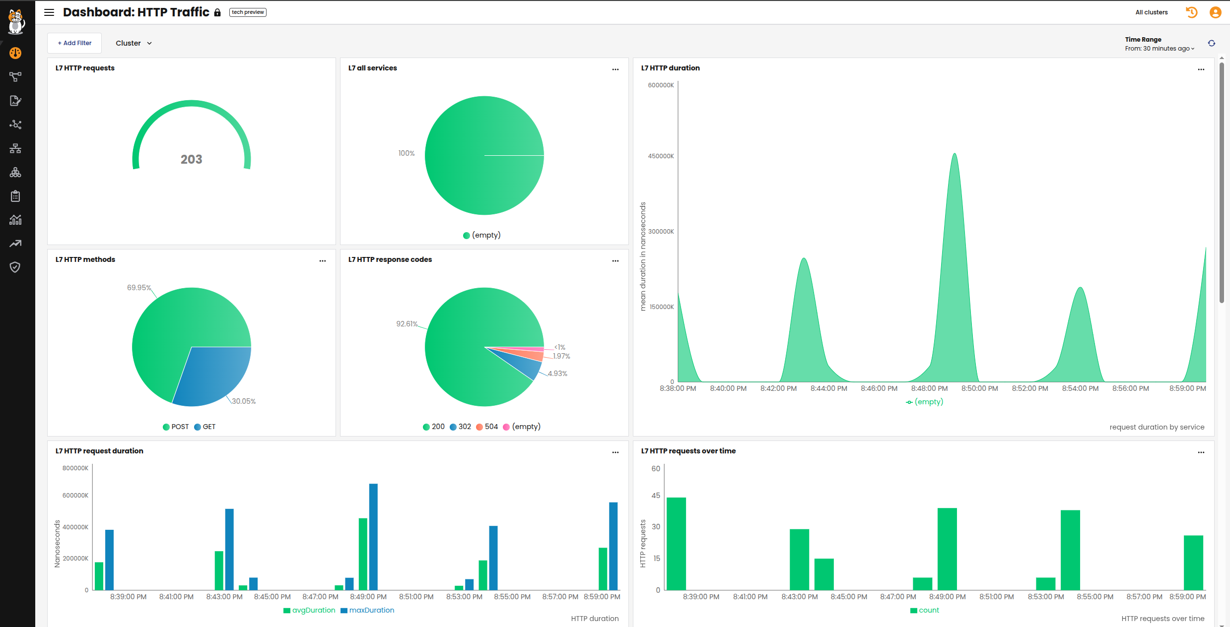 The HTTP Traffic dashboard provides application performance metrics for in-scope Kubernetes services. The data can assist service owners and platform personnel in assessing the health of cluster workloads without the need for a full service mesh. L7 logs are not enabled by default, and must be configured.